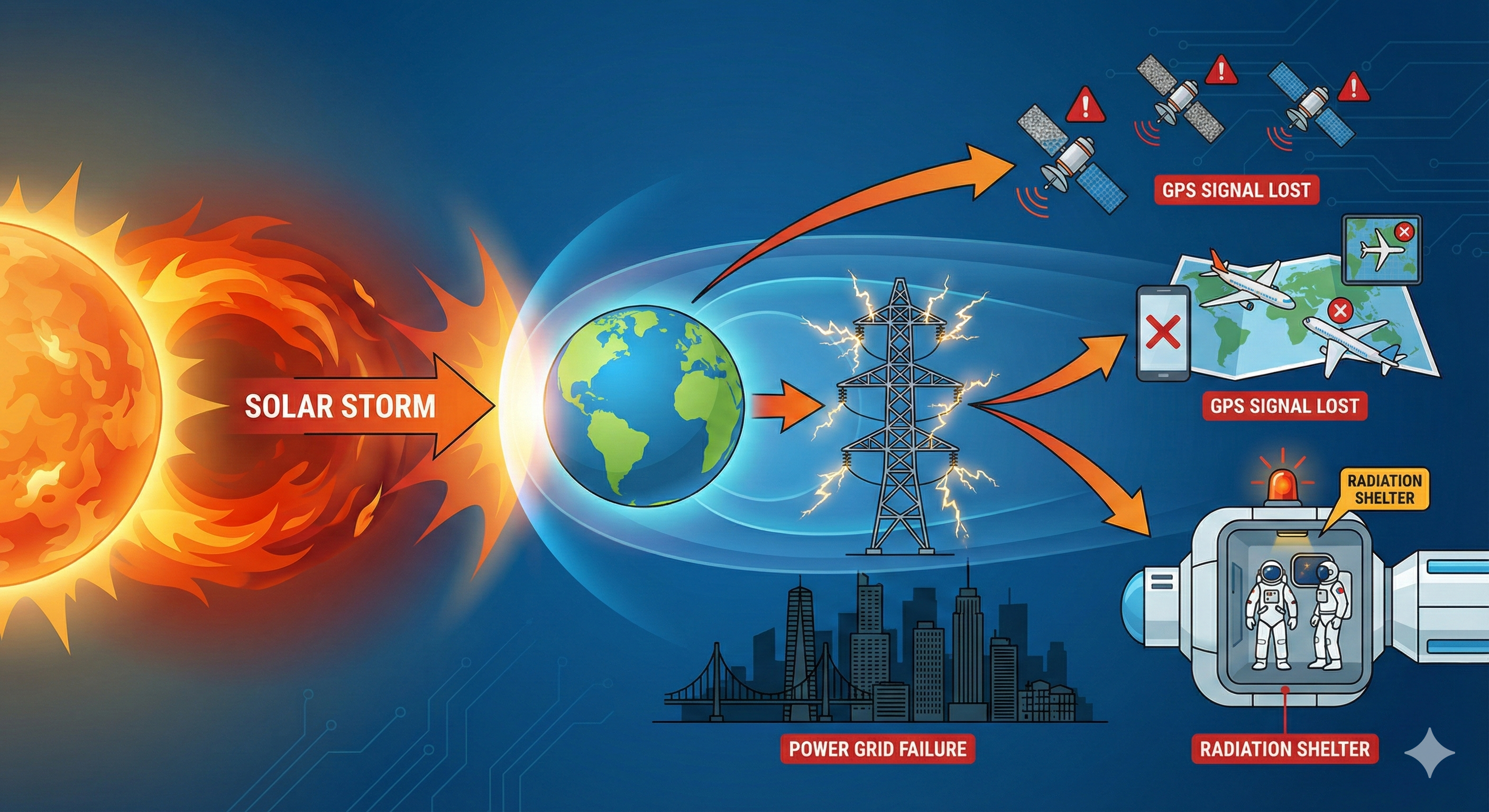 - 電力網の崩壊:高圧送電線に巨大な誘導電流が流れ、変圧器が焼き切れます。これにより、広範囲で数週間から数ヶ月に及ぶ大停電(ブラックアウト)が発生する恐れがあります。